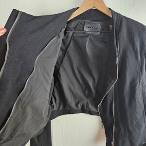Key features: black thick crepe fabric with ribbed underarms and mesh panels, long sleeve, zipper forearms, double zip closure, crop back