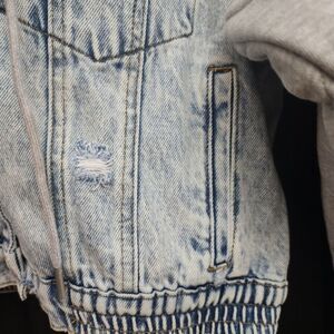 Look like a rockstar wearing this Blank NYC Denim Jacket with Grey Quilted Sleeves and Removable Hood.