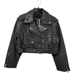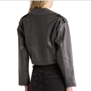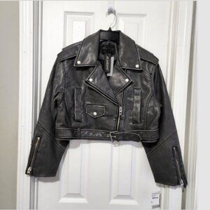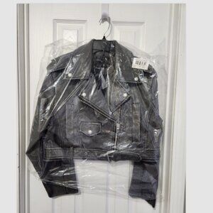 Blank NYC Dark Gray Faux Leather Crop Moto Belted Jacket WOMEN'S Size Medium New With Tags at $128 MSRP from Nordstrom Rack. Show off instantly cool style in this faux-leather moto jacket fashioned in a cropped silhouette. Manufacturer's color name is Back in Time. It is a dark gray, it has a retro look. Measurements: Bust: 21" pit to pit; Shoulder to shoulder: 17"; Length: 17.75" from center back of neck to hem; Sleeve: 21.25"