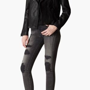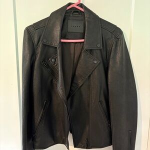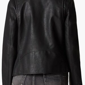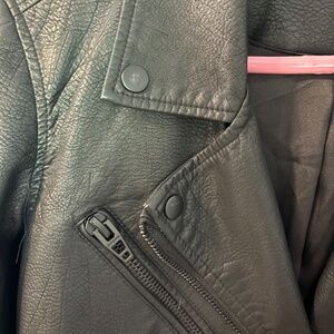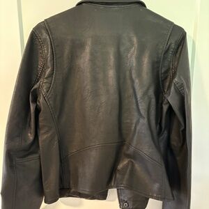 Black faux leather jacket size M. Gently used with minor scuffs on buttons.