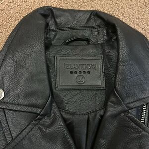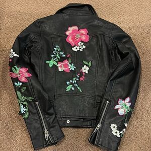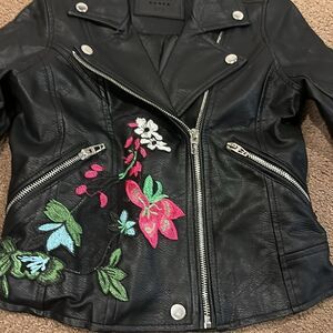 Blank NYC Faux Leather Motorcycle Jacket with Floral Patches. Silver Zippers. Approx 15.5” pit to pit and 17” shoulder. Gently worn. Size M.