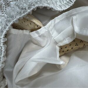 Light silver, faux leather, pleather, lined, pockets, elastic waist, laser cut floral pattern. Contemporary, casual, summer