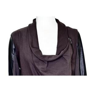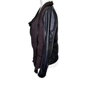 Blank NYC Gray Mixed Media Moto Jacket, asymmetrical zipper, vegan leather back, half sleeves, rolled collar. Size Medium. 3 small stains near zipper (see last picture). Measurements taken laying flat: