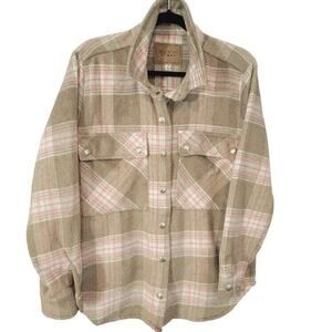 This women's size medium flannel jacket features a trendy checkered pattern in tan and pink hues, perfect for adding a pop of color to any outfit.