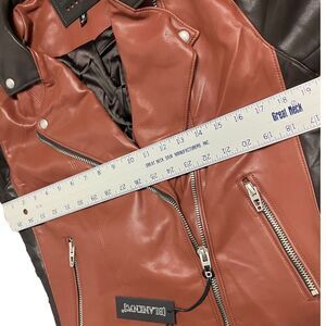 Blank NYC Jacket WMNS M Two Tone Black Brown Vegan Faux Leather Moto Biker NEW Unique Fall Layering fun Statement Contrast Sleeves
