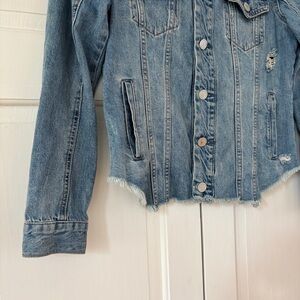 These casual trucker jackets are the perfect addition to a womans wardrobe for spring and summer fall or winter. Wear over neutrals or make a bold statement with a splash of color. Dress up or down and wear over a cami, crop or tank top. These jackets are a timeless classic that never goes out of style and are always trendy. Preowned no flaws. Distressed as pictured and raw hem. Light to medium wash.