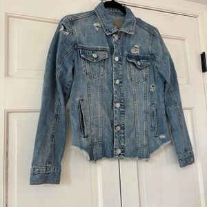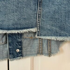These casual trucker jackets are the perfect addition to a womans wardrobe for spring and summer fall or winter. Wear over neutrals or make a bold statement with a splash of color. Dress up or down and wear over a cami, crop or tank top. These jackets are a timeless classic that never goes out of style and are always trendy. Preowned no flaws. Distressed as pictured and raw hem. Light to medium wash.