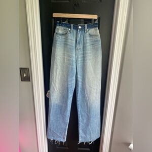 Stylish light blue flare jeans. Comfortable wide leg design. Perfect for casual wear.