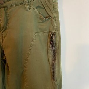 Military/Olive green style pant with industrial style zippers on front pockets and zippers down at hem of pants.