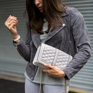 BlankNYC No Limit 100% Suede Leather Moto Jacket In Silverscreen Grey. Incredibly soft and always in style, this luscious suede jacket is a wardrobe must-have with its cool moto-inspired silhouette and gleaming hardware.