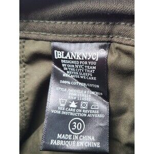These are Blank NYC olive green pleated pants for women in size 30. Made of 100% cotton, they feature a tie waist and wide-leg design with a relaxed fit. They are ankle-length and come with pockets and a belt for added comfort and style. Perfect for various occasions like travel, casual outings, workwear, or business attire.