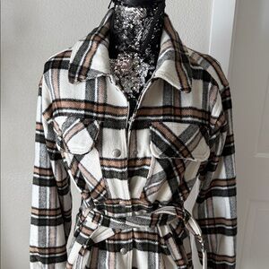 Stylish plaid jacket with a belted waist. Features button-up front and chest pockets. Perfect for layering.