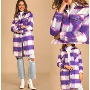 Not your average shirt jacket, updated in a longline silhouette and bright purple plaid, this BlankNYC shacket is anything but predictable.