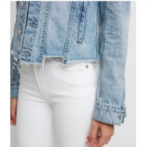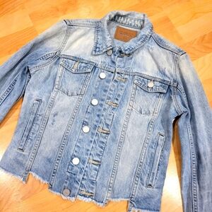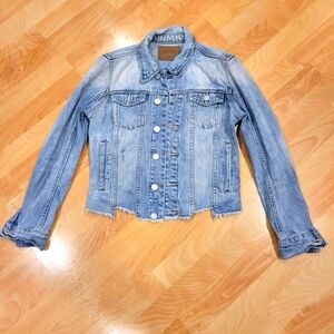 Stylish light blue denim jacket. Features button closure and classic design. Perfect for casual wear. Great over a sun dress on a cool night. Great for spring or fall looks. Raw hem. Super cute. No noted flaws.