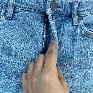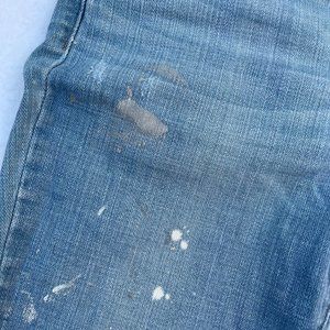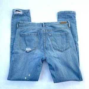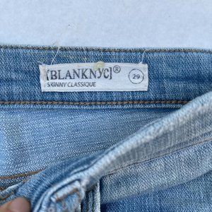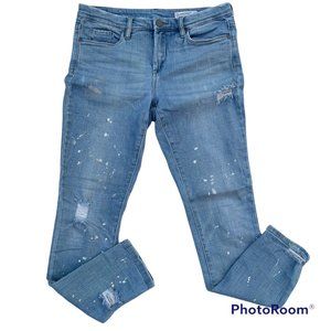 Pre-loved Blank NYC skinny classique jeans in a light denim wash featuring paint splatter in white and silver, manufactured distressing, whiskering, 5 pocket styling, belt loops and ankle length.
