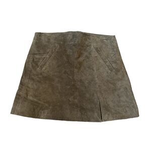 Features a chic utility style suede mini skirt. Fully lined. Front welt pockets. Exposed zipper back closure with metal ring pull 100% leather. Lining: 100% polyester. Professional leather cleaning recommended. Measurements in pictures. Note; color is called French gray but the color is an olive green hue.