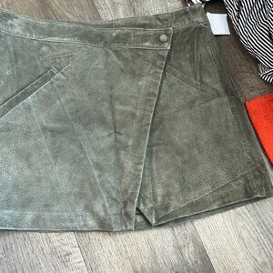 Blank NYC Suede Wrap Skirt in Herb - NEW - Size 30. New with tags. Sold at Nordstrom. Color is called Herb. Soft stippled suede is cut with diagonal seaming on this wrap-front miniskirt secured with a covered snap set at a rakish angle. Extra button provided. Snap closure with inner button.