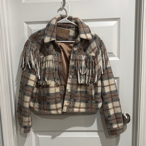 Stylish plaid jacket with fringe details. Features a mix of brown, cream, and tan colors.