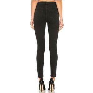 High rise super stretch black denim with zipper fly. A clean addition to any outfit. Clean black wash with tonal threading brings a luxe look. Fit runs true to size.