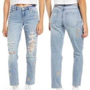 Distressed jeans with snakeskin star appliqué throughout