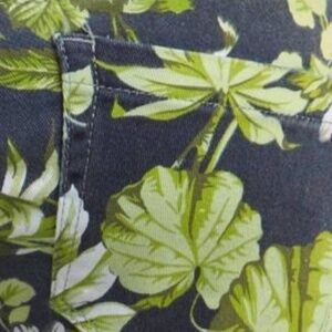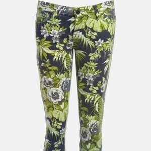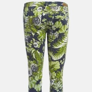 Lush, tropical foliage wraps skinny cigarette-leg jeans with five-pocket styling.