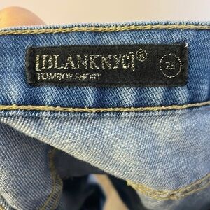 Blank NYC Tomboy Short Distressed Cuffed Raw Hem Denim Jean Shorts size 25. Good preowned condition. Cuffed raw hems. Pockets front and back. Zipper and button closure. See pictures for measurements. See pictures for distressing. Distressed denim.