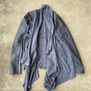 Features: cascading drape down the front of jacket. Long sleeves. Zip detail. Lined