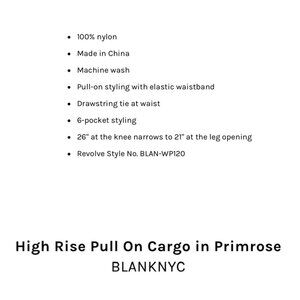 Elevate your travel and casual wardrobe with these NWT Blank NYC Women's Cargo Pants in Primrose Pink. These pants are made of 100% Nylon and are machine washable for your convenience. The pants feature a high rise waistband with an adjustable drawstring closure for a relaxed fit.