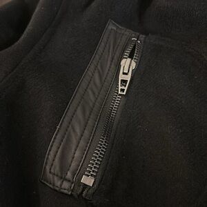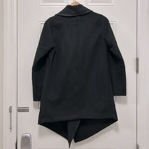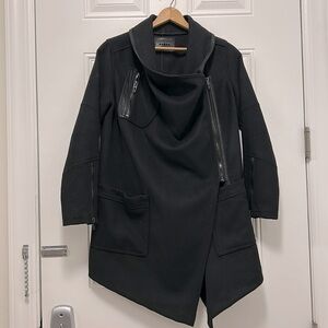 Black wool and polyester asymmetrical zippered jacket. Can be open for a more shawl look or zippered. Chic and minimalist. I’m a size 10/12 and this fits good.