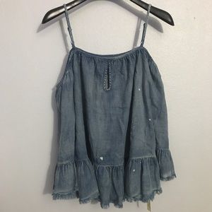 Bleach splatters and raw, fraying edges add rough-and-tumble authenticity to this girly off-the-shoulder top made from faded lightweight denim and finished with lush ruffles.