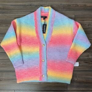 Blank NYC I Hope So rainbow cardigan sweater in a pastel ombre color. Cute and cozy sweater with pockets at the side seams. Please see pictures for more details and measurements.
