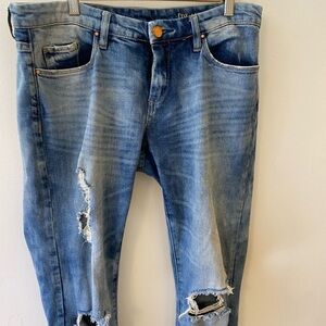 Perfectly distressed and worn Blank NYC medium bleach wash denim. Size 28, waist measures approximately 15.5 and length is approximately 30”. Gently pre worn condition. (Y)