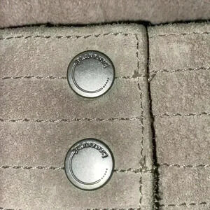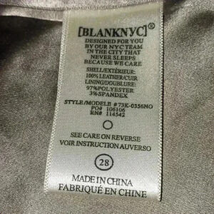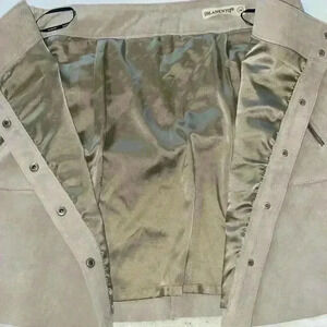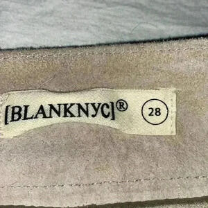 Blank NYC tan suede snap front mini skirt. Skirt is in good condition, however there is a mark near the back hemline that appears to have been where a sticker was. Not super noticeable unless you look close (view last photo). Size 28. Waist measures 29” & skirt is 17” long. Fully lined.