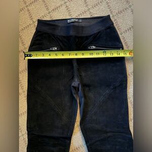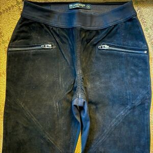 Blank NYC black leggings with faux suede front panels. 26. 2 silver zippered pockets on front. Pull on elastic waist. Plain legging style on the back. Leather BlankNYC label on back waistband. Never worn. Excellent condition with no rips stains and tears.