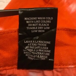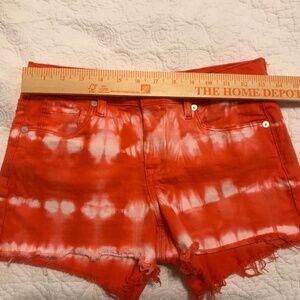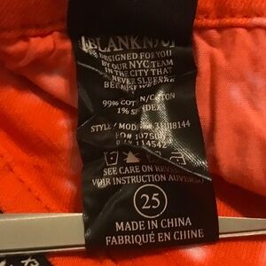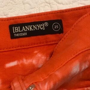 Tie-dye orange and white denim shorts by [BlankNYC], with button fly closure. Has belt loops and 5 pockets (3 in front, 2 in back) and raw hem. 99% cotton / 1% spandex (size 25). Measurements in pics. Machine wash cold, inside out, tumble dry low. Gently worn, in great shape. Cute summer shorts!