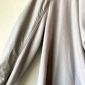 * Features: gray moto jacket with faux leather and cotton mixed media styling, asymmetrical zipper to allow for a drapey look, or wear open