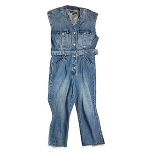 Blank NYC Denim Jumpsuit WMNS M Blue Relaxed Fit Belted Cropped Raw Straight Leg Snap Button Classic Western Rodeo Cowgirl Trendy Canadian Tuxedo Layer On Trend