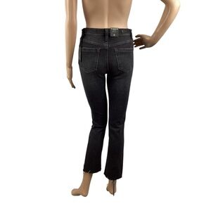 BlankNYC The Madison Crop jeans in a washed black shade with bold distressing at the knees and a raw frayed hem. The high-rise fit and cropped straight leg make these a stylish staple for any wardrobe. With a five-pocket design and button-fly closure, these jeans combine classic construction with a modern edge. The soft, structured denim offers just the right amount of stretch for comfort while maintaining a structured look.