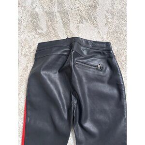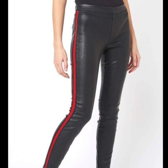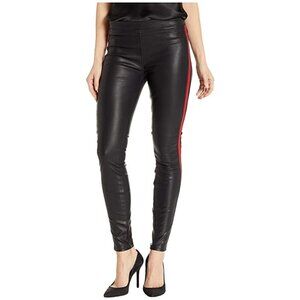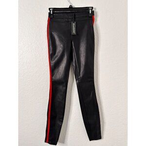 These BlankNYC pants combine a sleek design with a bold red stripe, offering a contemporary look. They're crafted from vegan leather, providing a luxurious feel while maintaining an ethical approach to fashion. The pants are designed for a snug fit, enhancing the silhouette, and suitable for both casual and formal settings.
