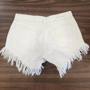 Stylish white denim shorts with fringe detailing. Perfect for casual outings and summer days.
