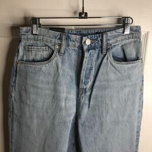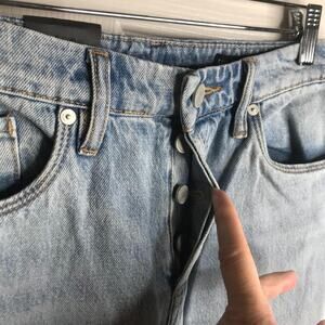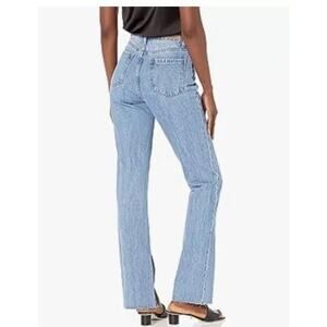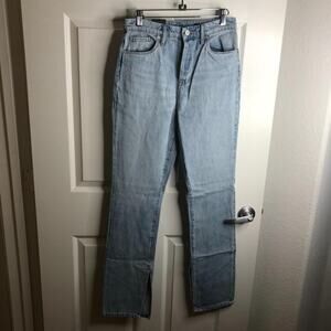 Light blue flat front high-rise jeans with button-fly closure and classic 5-pocket styling. Has slim straight legs and 8.25" slit at inner bottom hemline.
