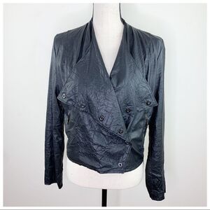 BLANKNYC Women’s Vegan Crinkled Black Leather Slim Fit Moto-Jacket w/Cross-Over Snap Closure Sz L. Great used condition, with one-snap that sometimes does not want to work as shown. It still holds together without it. Two front zip pockets. Very lightweight and adorable with jeans or over a boho dress or skirt. Please see photos for additional details. Pit to Pit 21“ Length 20“ Sleeve 23“