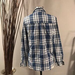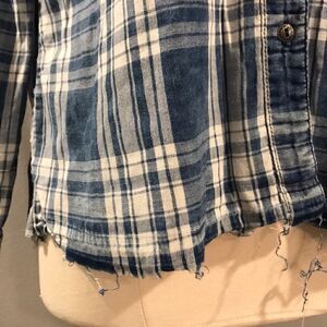 BlankNYC plaid button down shirt. Blue and white with frayed hem for a relaxed look. Like new.