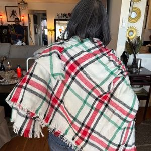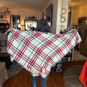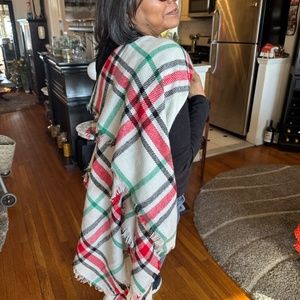 Plaid huge Scarf/Cape/Wrap in a lovely plaid of red, green and black on white.With fringes.