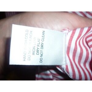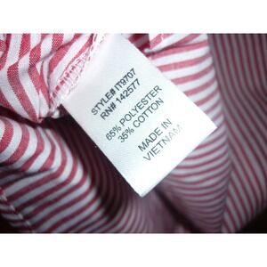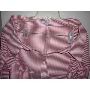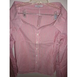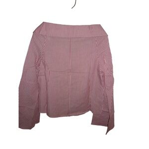 Blouse with red and white vertical stripes. Features an off-the-shoulder neckline with a square cut and ruffled trim. Long bell sleeves add a touch of flair. Button-up front closure. Perfect for a brunch date, a casual outing, or a stylish day at the office.