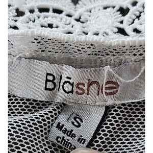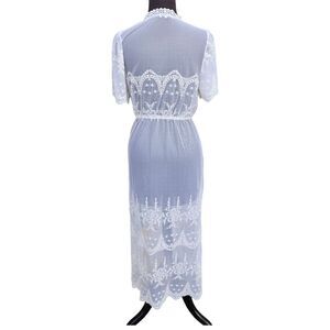The Blashe White Lace Kimono Swim Coverup in size S is a stylish Bohemian festival outfit. Made from a comfortable cotton blend fabric with a stretch feature, this long dress with short sleeves and a tie closure is perfect for a party or cocktail event. The white lace pattern adds a touch of elegance to the overall bohemian theme, making it a unique and fashionable choice for women looking to make a statement. The brand Blashe ensures quality and style in this statement piece. See pictures for measurements