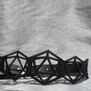 Made of genuine Italian leather in geometric shapes. Closes in the back with a buckle. Handmade, small series, in Rome, Italy. One size, adjustable. Smallest setting approximately 12.5", largest setting approximately 16.5".