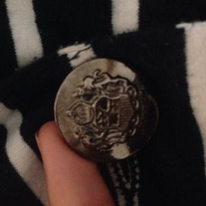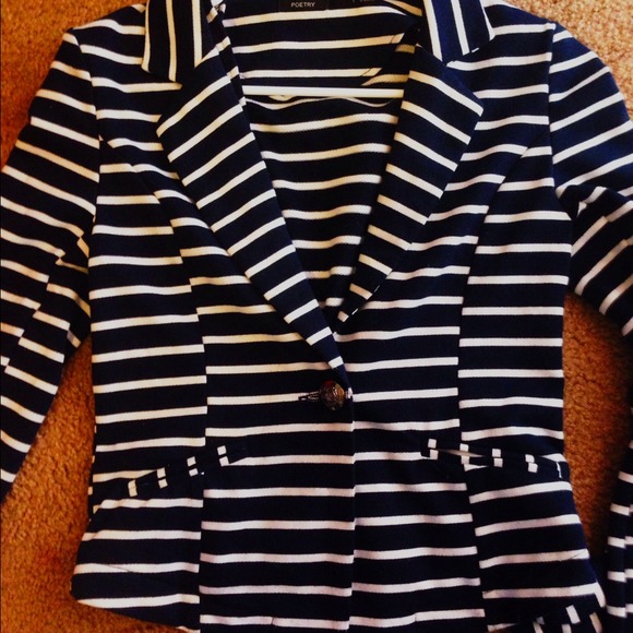 Navy blue and white blazer fits very well to body and is in perfect condition, wore it once for an interview! Has one silver button in the middle and on the sleeves