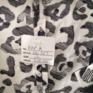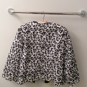 Loose fit blazer, 100% cotton, 100% silk cuff and hem. Cute with jeans, shorts, dress or skirt. Black and white with yellow trim.
