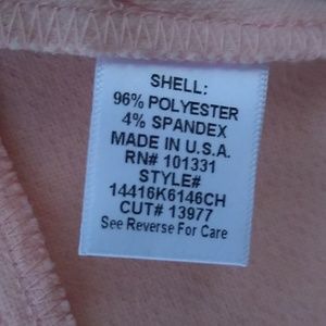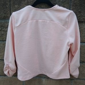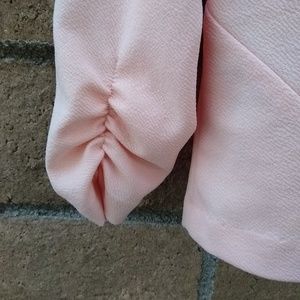 This is a light pink Charlotte Russe blazer that is perfect for dressing up a casual outfit, enhancing a dress, or wearing to the office. It hits about mid-torso high and has a ruched effect on the sleeves. The sleeves themselves hit right below the elbow. Only worn once or twice, in very new condition.